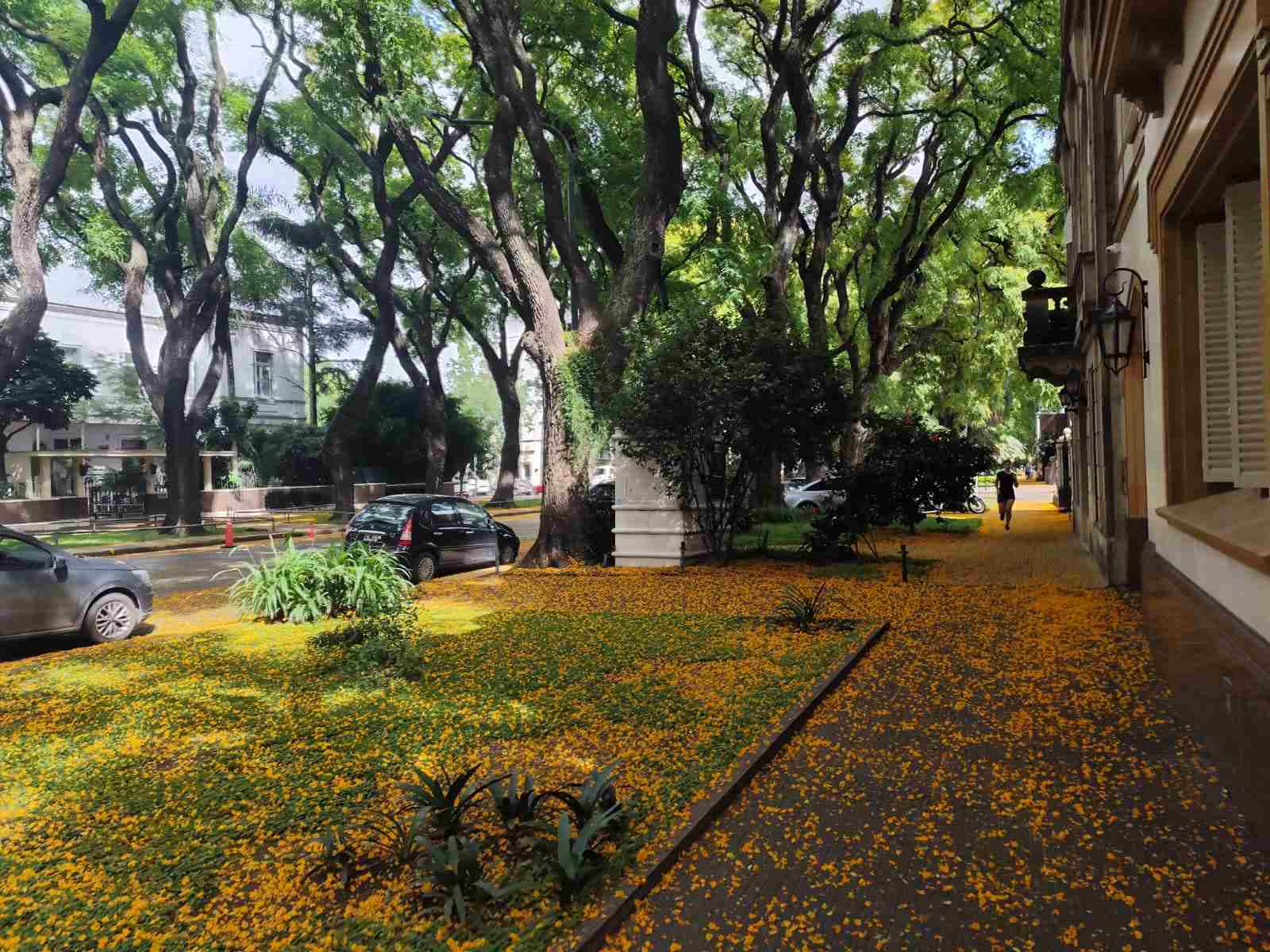 - Tipa Tree / Tipa blanca (Tipuana tipu) – 3% of sidewalks and 8% of parks. Their long, graceful branches form the famous “Túnel de Tipas” on Melián Street, one of my favorite places in the city — a natural cathedral of intertwined trunks and filtered sunlight. In December, their yellow flowers fall and create a golden carpet on the ground. There’s also a small insect that releases drops of liquid from the branches, producing a “raining effect” that makes the experience even more magical.