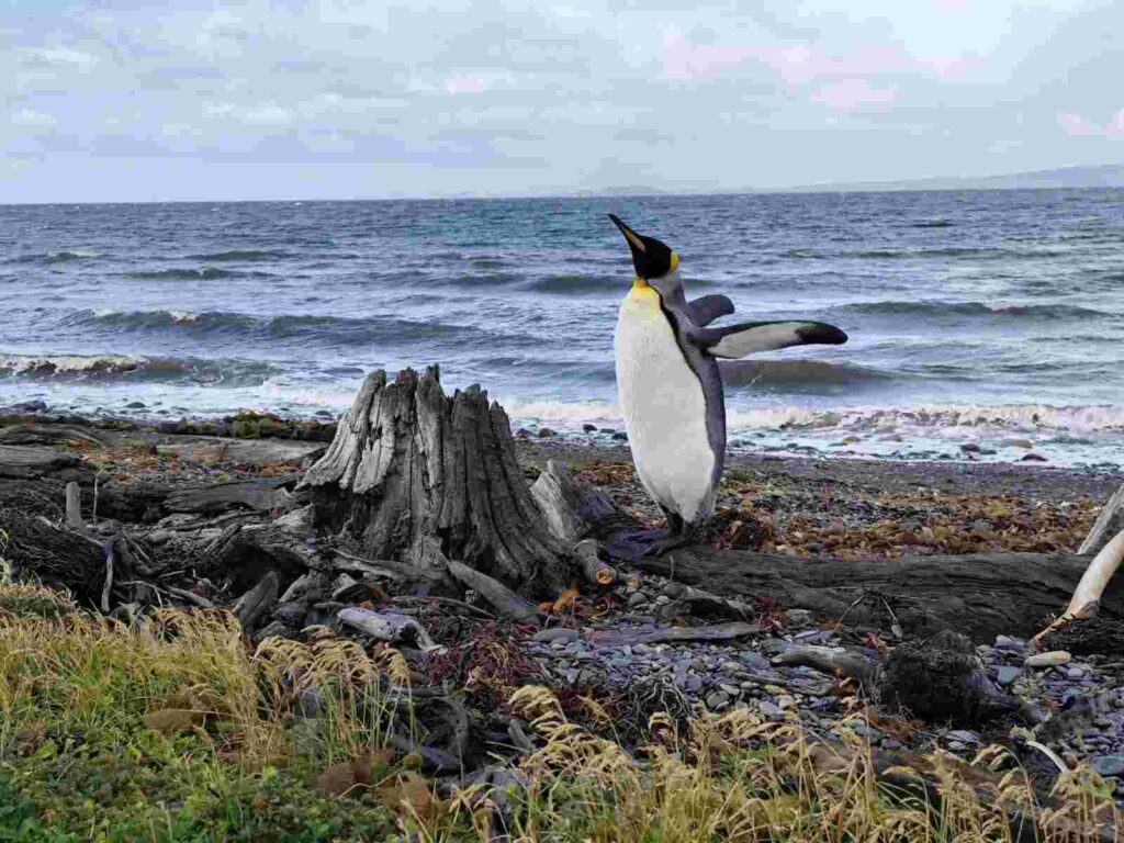 What truly surprised me, though, was finding a lone King Penguin on a deserted beach along the Beagle Channel, right before starting an expedition to Peninsula Mitre. It’s not rare to see them there, because there are a few in Martillo Island, but is neither common. We were driving on a gravel road four hours east of Ushuaia when I saw it: a solitary penguin standing with wings open against the wind. The grey skies, the cold air, the remote silence — it was one of those moments that stay forever.